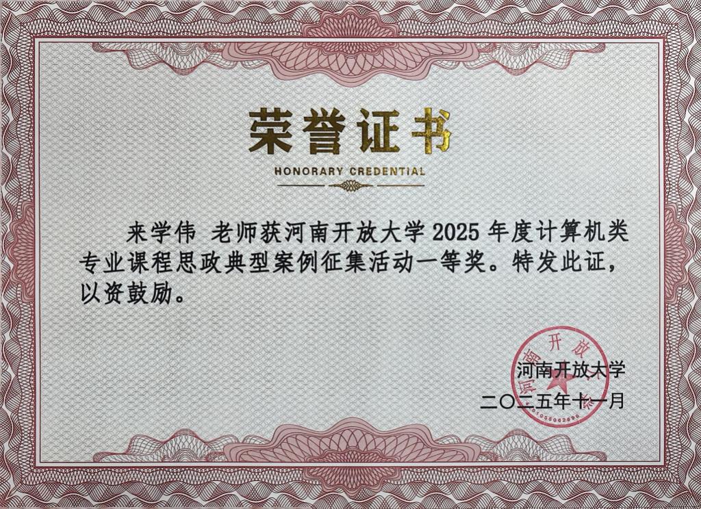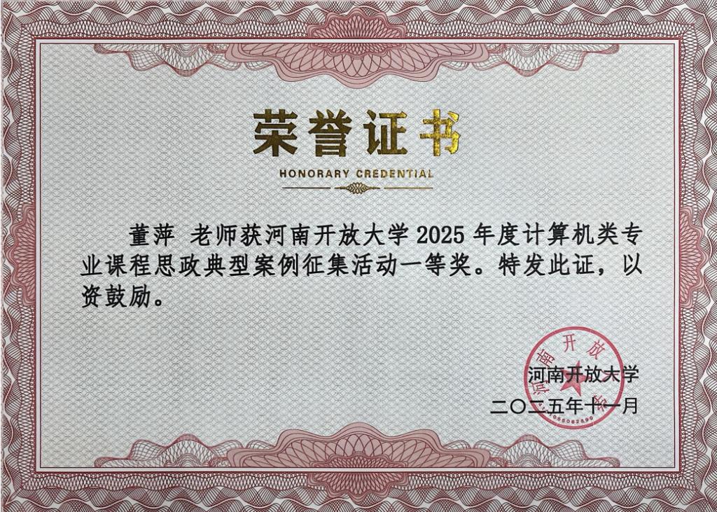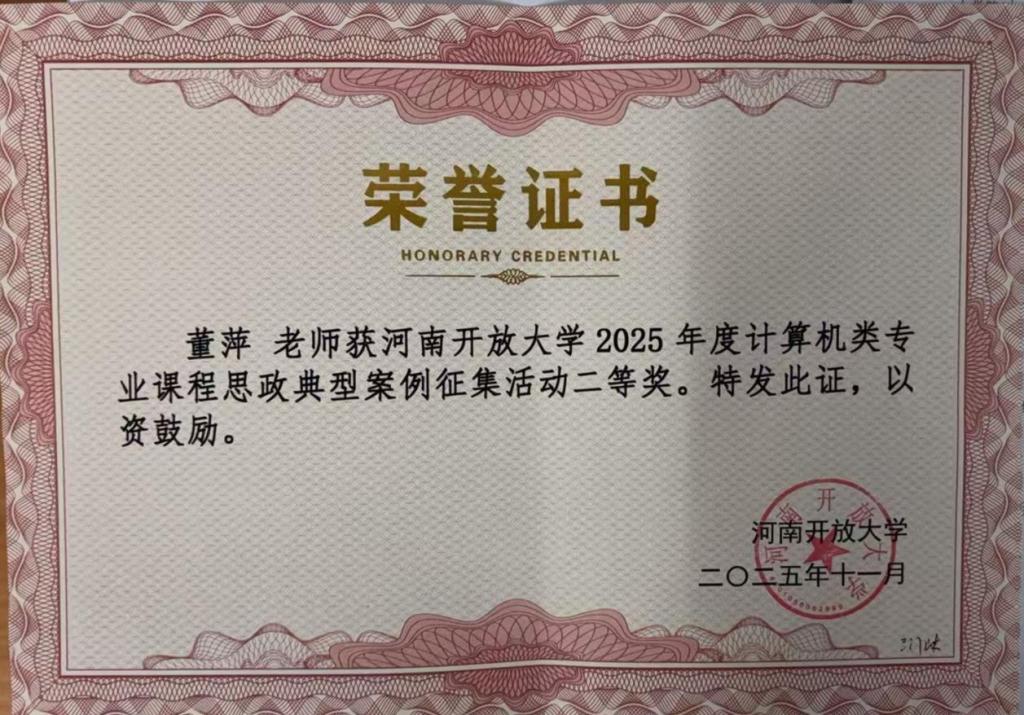 近日,河南开放大学2025年度计算机类专业课程思政典型案例征集活动评选结果正式揭晓,球王会平台教师凭借深厚的教学积淀与创新的育人设计脱颖而出,喜获佳绩!其中两位教师分别斩获一等奖2项、二等奖1项,用扎实的教学实践彰显了球王会平台课程思政建设的丰硕成果。