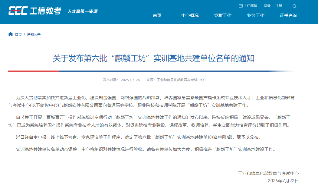 据悉,工业和信息化部教育与考试中心联合麒麟软件有限公司面向普通高等学校、职业院校和技师学院开展“麒麟工坊”实训基地共建工作,是为了深入贯彻落实加快推进新型工业化、建设制造强国、网络强国的战略部署,培养国家急需紧缺国产操作系统专业技术人才。目前,“麒麟工坊”已成为系统培养国产操作系统专业技术人才的有效载体,对促进院校专业建设、课程改革、教师培养、学生实践能力培育评价起到了积极作用。