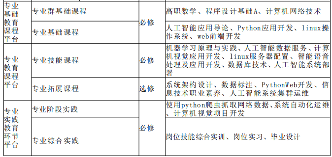 本专业课程体系是基于“人工智能应用开发与维护”专业核心能力和岗位能力要求构建的。以工作岗位中的工作任务作为划分课程的依据,根据人工智能应用的数据处理、开发、部署、维护这一完整过程为主线,以数据服务、应用开发和系统运维课程为核心,将其他岗位所需的课程不断融入主干课程之中,形成了面向岗位能力定位的课程体系。